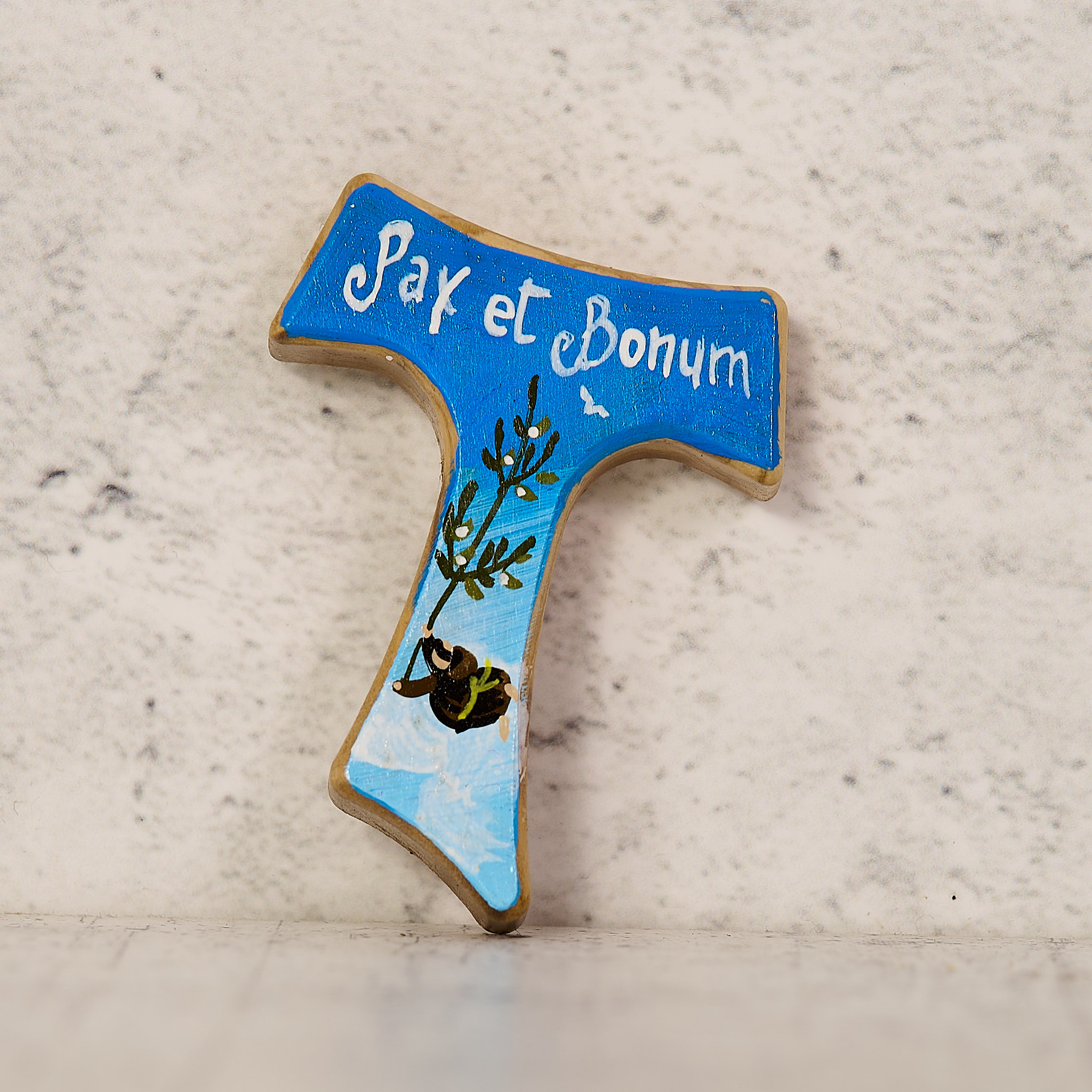 Von Hand gemalter Tau mit Acrylfarbe auf Olivenholz.