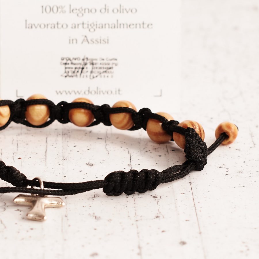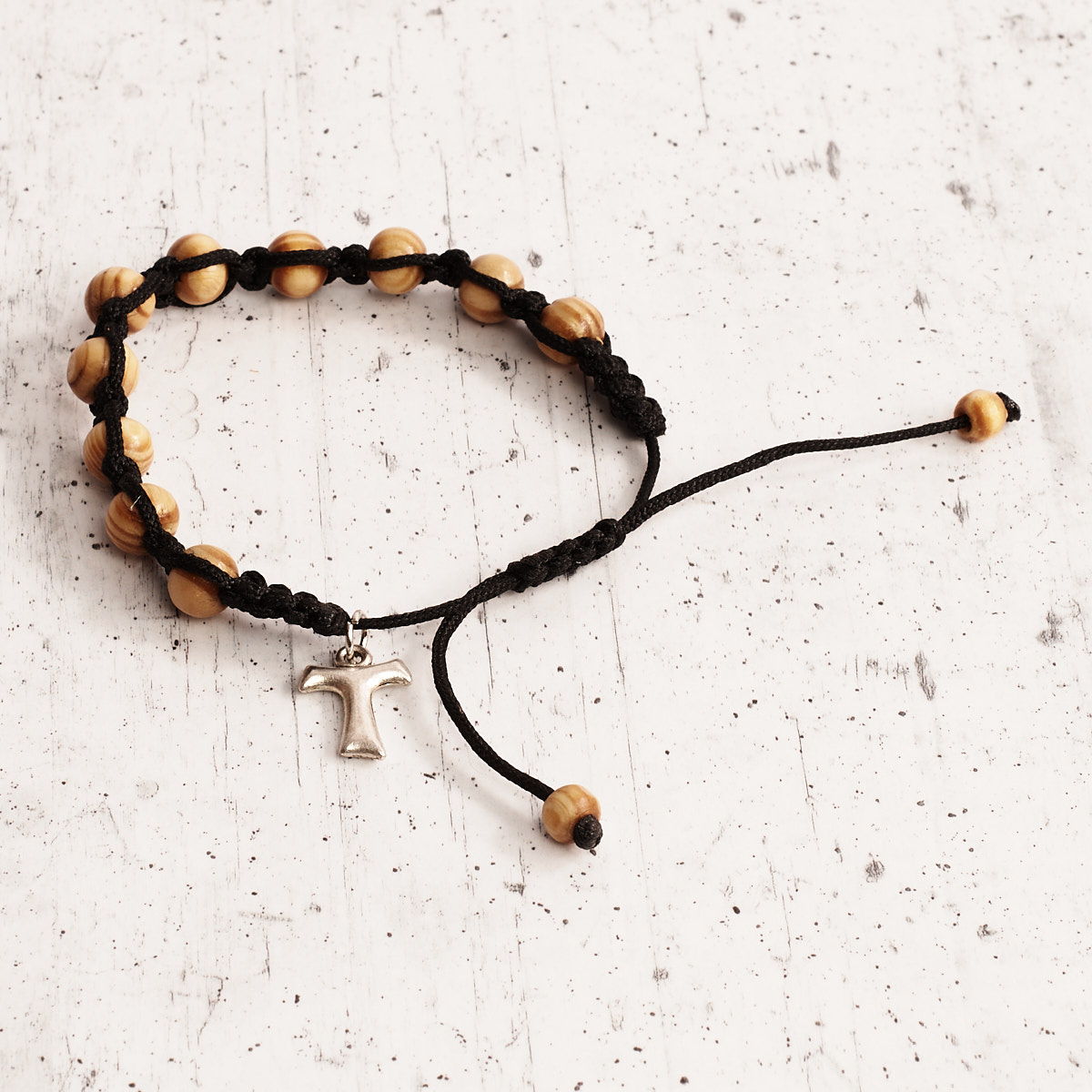 Bracciale a decina unisex. Sfere in olivo da 8 mm. Tau 12×15 mm in metallo nichelato anallergico. Taglia universale. Assemblato a mano con nodo macramè.